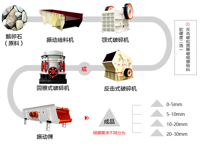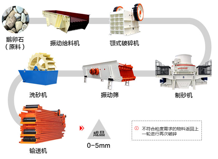 大块的鹅卵石需要粗碎后才可以进入细碎机进行细碎,细碎粒度合适的鹅卵石被送入制砂机进行细碎加工,制砂后的鹅卵石由圆振筛进行筛分,较大粒级鹅卵石返送至制砂机再次破碎,符合需求的则由皮带机送至储料堆贮存制成鹅卵石砂子的物料被送入洗砂机清洗,清洗后,作为最终产品的一部分,由皮带机传送至储料堆进行包装
