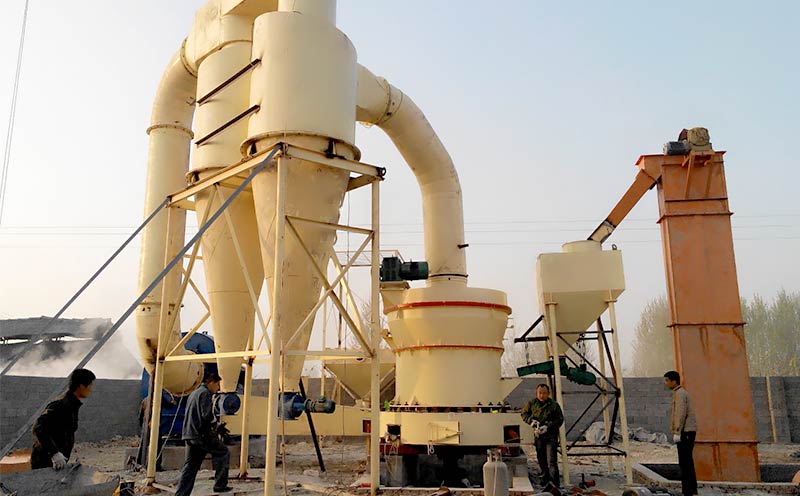 3.磨粉系统——储料仓中的石膏原料经电磁振动给料机均匀连续地送入雷蒙磨粉机内,进行磨细精加工。然后,经风机、分析机共同作用,分选出符合细度要求的石膏生粉。该粉磨系统主要设备配备为:提升机、储料仓、振动给料机、雷蒙磨粉机等。