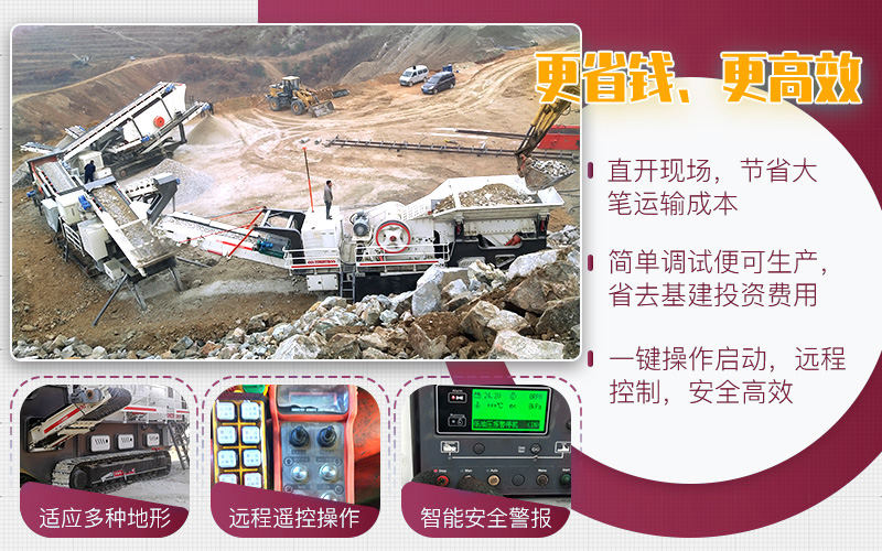 大型磕石制砂一体机是通过轮胎式或履带式车架与鄂破、反击破、锤破、圆锥破、制砂机、振动筛灵活配置,整体搭配紧凑,油电两用,配有PLC智能电控箱,可远程控制,根据客户的实际生产状况不同,配置方案多种多样,比如以下客户的方案。